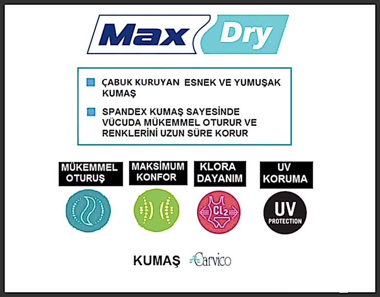 MaxFit %80 PA %20 EA'dan yapılmıştır. Mat görünümlü 4 yöne esneyebilen bir kumaştır. Mükemmel hafiflik, elastikiyet ve dayanıklılık dengesi sayesinde mükemmel uyum ve rahatlığı garanti eder. LYCRA XTRA LIFE elastik iplik ile klora karşı dayanıklıdır. 50+ UV korumaya sahiptir. Boncuklanma ve aşınmaya karşı çok dayanıklıdır.