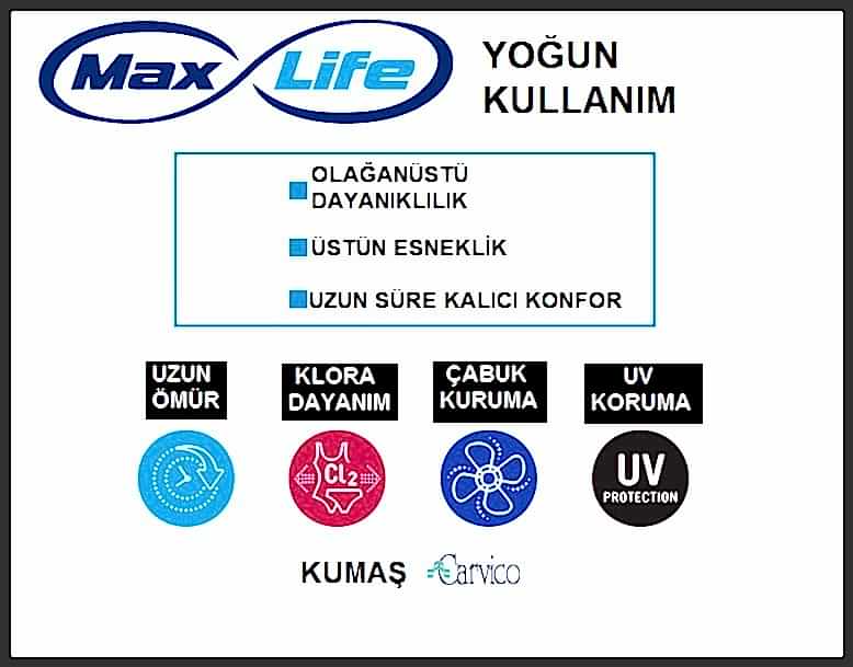 MaxLife, klorlu suya maksimum direnci garanti eden, ARENA’ya özel %100 PE kumaştır. Bu kumaş, 21 aylık geliştirme ve 200'den fazla laboratuvar denemesinin sonucudur. Çok iyi esneklik sağlayan özel olarak tasarlanmış PE iplik kullanılan Max Life yapısı, vücuda mükemmel uyumla dayanıklılığı bir araya getirmektedir. 240 saatten fazla kullanımdan sonra, MaxLife orijinal özelliklerinin %95'ini korumaktadır. Çabuk kurur ve 50+ UV korumaya sahiptir. Tüm bu özellikler, MaxLife'ı yoğun yüzme için en performanslı kumaş haline getirmektedir.